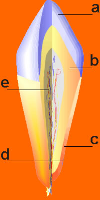 a=Zahnschmelz; b=Dentin; c=Zement; d=Wuzelhaut,