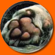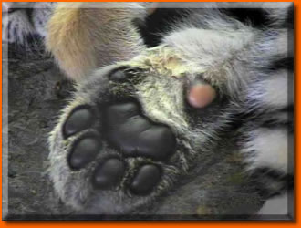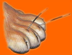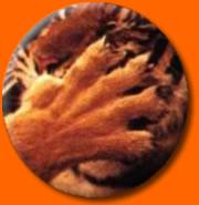 Die ersten beiden Abbildungen von links sollen nocheinmal die Funktion der Krallen darstellen. Die rechte Grafik stellt eine Zeichnung einer verwundeten Pranke dar, auf der man auch sehr schön erkennen kann, wo die Krallen befindlich sind und wie die Anordnung dieser bei nährere Betrachtung aussieht. Hier dargestellt ist eine Tatze in der die Stacheln eines Wildscheins stecken. Dies kann in der freien Natur hin und wieder vorkommen und ist sehr schmerzhaft, da sich diese Stacheln durch ihren Aufbau langsam durch das Fleisch hindurch bewegen. Mehr Informationen hierzu findet man unter "Jagdverhalten des Tigers". Die letzten Darstellungen in diesen Kapitel beziehen sich nochmals auf die Eigenheiten der Tigerpranken. Die linke Darstellung ist ein Gibsabguss einer Tigerpranke, die ich leider nicht in besserer Qualität einscannen konnte. Die Pranke ist im Durchschnitt 14,0cm hoch und 11,4cm breit. Das nächste Bild weiter links ist eine Photograhpie eines realen Prankabdrucks im Sand. Die letzen beiden Bilder zeigen die Sohle einer Tigertatze. Sie ist immer schwarz gefärbt, lediglich die fünfte Zehe (Pollex) ist hell gefärbt. Dies ist die Färbung bei "normalfarbenen" Tigern. Bei den weißen Tigern ist es so, daß die komplette Sohne der Tatzen hell ist, da auch hier wie beim Fell Melaninmangel vorhanden ist. Diese zeigt die ganz rechte Darstellung. Mehr Informationen über weiße Tiger findet man in der entsprechenden Rubrik. Ich hoffe, daß ich die Informationen im Zusammenhang mit den Tatzen und den Krallen des Tigers verständlich und komplett darstellen konnte. Obgleich es sicherlich noch mehr zu sagen gäbe ist das Problem meistens, daß es keine geeigneten Darstellungen gibt. Somit möchte ich dieses Thema schließen und hoffe, daß es viele Informationen weitervermitteln konnte. Falls es noch weitere Fragen gibt, kann man mir hier