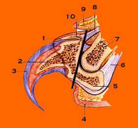 (7), gebündelte Streckmuskelsehnen (8), Haut der Klauenscheide (9),
