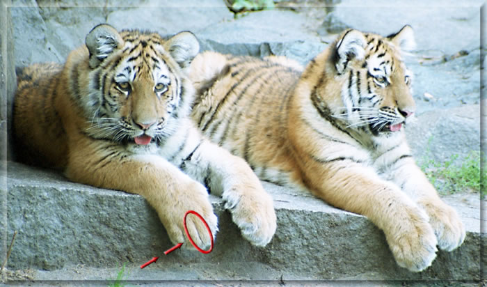 Ein weiterer Aspekt der betrachtet werden sollte ist hier der Umstand des Einsatzes der Krallen. Obwohl ich mich hier explizit mit dem Tiger beschäftige treffen die meisten Aussagen auf viele andere Mitglieder der Familie der Felidae ebenfalls zu. Meistens ist die Rede von der Fähigkeit der Felidae ihre Krallen einziehen zu können. Dies ist streng genommen so nicht haltbar. Eigentlich sollte man vor herausstreckbaren Krallen sprechen. Werden diese nicht benötige sind sie in lederartigen Hautscheiden vor Abnutung und Beschädigung geschützt. Die einzige Ausnahme unter den Großkatzen ist der Gepard (Acinonyx jubatus), der nicht in der Lage ist seine Krallen einzuziehen (die Nomenklatur spricht für sich). Der Tiger besitzt an jeder Extremität fünf Zehen. An den beiden Armen (Vorderfüßen) besitzt jede Zehen eine sichelförmig gebogene Kralle, wobei zu beachten ist, daß die erste Zehe, die auch Pollex genannt wird, stark verkürzt ist und daher den Boden während des normalen Gehens in der Regel nicht berührt. An den Hinterfüßen des Tigers befinden sich zwar ebenfalls fünf Zehen jedoch ist die erste Zehe, die auch Hallux genannt wird, ebenfalls nicht voll ausgebildet. Die Hallux ist sogar nur rudimentär am Skelett des Fußes vorhanden und tritt äußerlich gar nicht mehr in Erscheinung. So tragen natürlich auch nur die vier verbleibenden Zehen eine Kralle, die in Form und Größen den vorderen ähneln. Gesondert zu erwähnen ist auch, daß die zweite bis fünfte Zehe der Vorderpranken jeweils drei Gelenke besitzen, während die erste Zehe nur aus zwei Zehenglieder (Phalangi) besteht. Die Krallen erreichen eine Länge von bis zu 100mm am Außenbogen gemessen. Es dürfte eigentlich nicht schwer sein sich vor Augen zu führen, was für eine Waffe diese Krallen darstellen. Sie werden oft in ihrer Bedeutung mit der der Primärangriffswaffe (Gebiss) gleichgestellt oder nur wenig darunter eingestuft. Mehr Informationen zur Muskulatur der Pranken und der Krallen