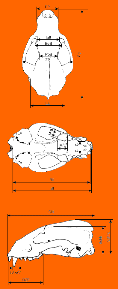 Geschlechterdifferenzierung -. Vermessung der Schädel Allometriegleichung Da die Anzahl der geschlechtsdeterminierten Schädel adulter Tiere, vor allem der Männchen, relativ gering war, wurden auch die Schädel juveniler Tiere mit bekanntem Geschlecht (%%: n ' 14; &&: n ' 5) in die Analyse mit einbezogen. Nach Untersuchungen von LÜPS (1983) ist beim Dachs das Längenwachstum des Schädels nach etwa sechs Monaten abgeschlossen, das Breitenwachstum hält jedoch noch an. Dieses wird erst im Alter von drei Jahren beendet (IL-FITURI et HAYDEN 1993). Aus diesen Unterschieden in der Wachstumsgeschwindigkeit resultieren altersabhängige Proportionsunterschiede und -änderungen, die als Allometrien bezeichnet werden.Um diese Größenunterschiede der untersuchten Dachsschädel zu erfassen und zu eleminieren wurde daher eine Allometrieanalyse über alle Schädel (Jagd- und Fundschädel) durchgeführt (EHRICH et REMPE 1980, FRAHNERT 1993). Die hier gewählte Methodik der Allometrieanalyse folgt im wesentlichen den Untersuchungen von FRAHNERT (1993).