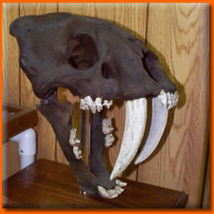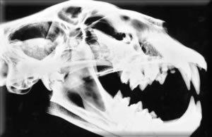 Auf der Photographie ganz links in der Schädel eines Amurtigers zu sehen. In dieser Frontansicht kann man sehr schön die Eckzähne des Ober- und Unterkiefers zu sehen. Desweiteren kann man auch die Nasenhöhle gut erkennen. Auch die prinzipielle Form stellt sich hier sehr gut heraus. Wie man auch einfach erkennen kann handelt es sich bei der mittleren Abbildung eine echte Rarität, ein Röntgenbild. Schwerer sind nur Wäreabbilder zu finden, diese kommen aber auch gleich noch an die Reihe. Das Bild ganz rechts zeigt natürlich keinen Tiger, sondern den Schädel eines vor Tausenden von Jahren verstorbenen Säbelzahntigers (Smilodon). Besonderst gut kommen hier die enorm vergrößerten oberen Fangzähne zur Geltung - diese konnten über 30cm lang werden.Von vom gesamten Körperbau her ist das Smilodon aber entweder gleich groß wie ein heutiger Tiger oder sogar kleiner.