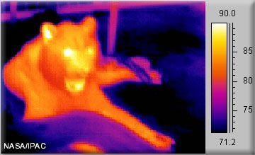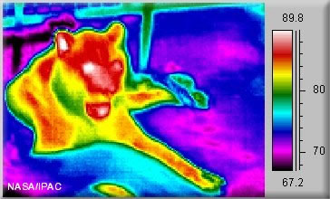 Diese Bilder sind etwas ganz besonderst. Neben der Tatsache es nur sehr wenige Infrarot-Hitzebilder von Tigern oder allgemein von Tieren gibt, sind diejenigen die es dann doch gibt meinstens nicht veröffentlicht worden. Deswegen freut es mich besonderst diese durch ein Zufall bekommen zu haben. Wie man deutlich erkennen kann wurde diese Bilder von der NASA/IPAC angefertigt. Wie man auf den ersten Blick sieht ist das untere Bild die gleiche Szenerie wie auf den Wärmeabbildern, nur eben mit einer normalen Kamera aufgenommen. Auf den beiden Wärebildern sind auch jeweile die Temperaturskalen die Dargestellt werden in Grad Fahrenheit aufgetragen. Die Fahrenheit-Skala ist wie unsere Celsius-Skala aufgebaut, nur das 100 Grad Fahrenheit der Körpertemperatur von ca. 37 Gard Celsius entstprechen. Das linke obere Bild zeigt eine grobe Wärmebildaufnahme und gibt uns einen Hinweis auf die grobe Wärmeabstrahlung eines Tigers. Die Abstrahlung des Menschen ist am Kopf besonderst stark, der dann bis ins extreme Rot erscheint (ich denke nicht das ein extra Bild dafür nötig ist). Der Rest des menschlichen Körpers ist dann meinste blau dargestellt, was bedeutet, daß rel. wenige Wärme abgestrahlt wird. Der Mensch strahlt also sehr unausgegelichen Wärme ab, während wir bei einem Tiger eine gleichmäßige Abstrahlung sehen. Auch beim Tiger ist die Abstrahlung am Kopf aber erhöht. Generell erscheint der Tiger "wärmer" in diesen Abbildungen, da sein Fell die Wärme des Körpers gut halten kann und somit röter erscheint. Gerade für die sibirischen Tiger ist dieses Funktion lebenswichtig, während die Tiger in wärmeren Breitengraden eher darunter leiden, daß die Wärme im Körper nicht so gut abfließen kann. Aus diesem Grund erscheint auch immer der Mund als besonderst warm, da ein Tiger durch hecheln die Hitze aus dem Körper nach außen leitet. In Grenzen ist es den Tigern auch möglich über die Stellung der Deckhaare des Fells die Wärmeisolierung zu steuern. Durch Muskelkontraktionen am Ansatz der Deckhaare können diese Aufgestellt oder flach angelegt werden. Bei flacher Anlage kann die Wärme nach außen hin besser abgegeben werden, während sich bei aufgestellten Haaren eine Art isolierender Luftschicht zwischen Haut und oberer Fellschicht bildet. Diese Luftschicht hält dann die Wärme besser am Körper (siehe Fell). Das ist auch einer der Gründe, weswegen Amurtiger auf Bildern aus der sibirischen Kälte immer sehr aufgeplustert erscheinen, dies dient der Wärmeisolation. Das zweite Bild rechts oben zeigt dann eine etwas hochauflösendere Abbildung der selben Szenerie. Bei höherer Auflösung kann man deutlicher erkennen, daß der Kopf wirklich ein Zentrum für die Hitzeabgabe ist. Das der Rest des Körpers ansonsten sehr gleichmäßig die Energie abgibt kann man auch deutlich sehen. Die einzige Ausnahme von dieser Regel kann man im rechten Teil der beiden Wärmebilder erkennen. Es handelt sich um einen dunklen Streifen, der über beiden Beinen hinweg zu gehen scheint. Bei einem Vergleich mit dem normalen Bild wird man schnell herausfinden, um was es sich handelt. Es ist der Schwanz des Tigers, der in der Tat auf diesen Aufnahmen sehr bläulich, somit kühl, erscheint. Der eine oder andere mag nun nach dem Sinn für solche Aufnahmen fragen, diesen kann man auch sehr einfach darlegen, auch wenn man nicht auf Anhieb selbt auf diesen gekommen wäre. Durch Wärmebilder kann man erkennen, ob ein Tier (inkl. Mensch) gesund oder krank ist. Das Hitzebildprofil ist für jedes Tier individuell, so daß man sogar anhand dieser Bilder, wie bei einem Fingerabdruck, eine Identifikation durchführen kann. Die meisten Krankheiten verursachen auch eine Änderung in diesem Hitzeprofil. Man kann auch gleich erkennen in welche Köperregion die Abweichung ist und somit sogar unter Umständen direkt sagen an was der Tiger (das Tier oder der Mensch) leidet. Dies ist einer der Hauptvorteile den solche Bilder bringen. Natürlich sind auch andere Erkenntnis herzlich willkommen.