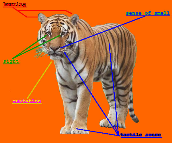 On these page you might find full information about the senses of the tiger. However, most aspects apply for all members of the family of the cats, although much information refers explicitly to the tiger, nothing other should be noticed. However you should now select a sense for themselves: |